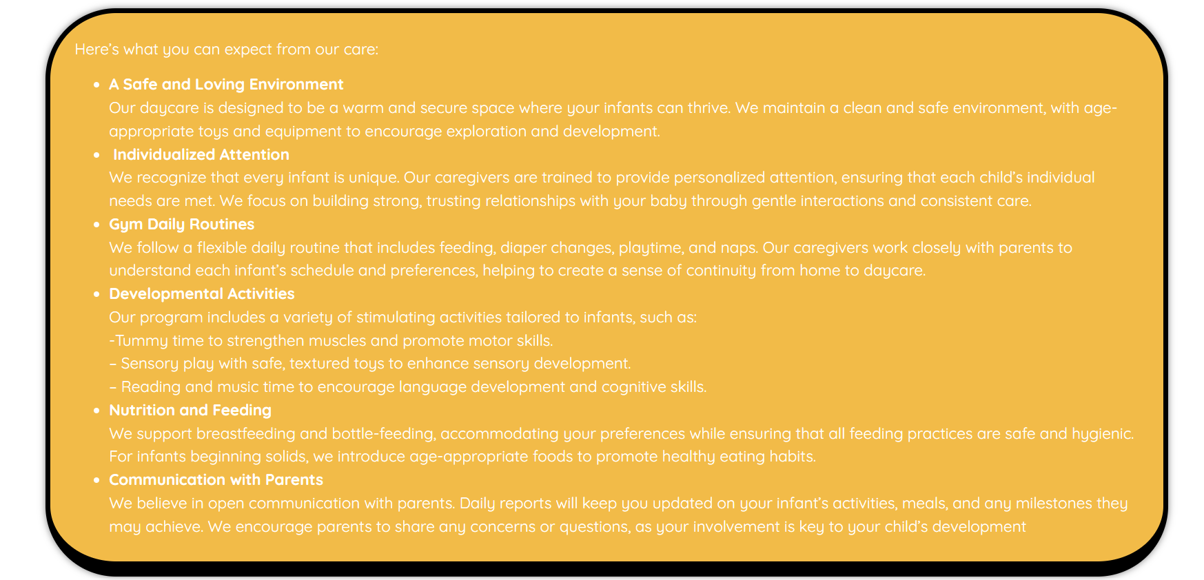 We recognize that every infant is unique. Our caregivers are trained to provide personalized attention, ensuring that each child’s individual needs are met. We focus on building strong, trusting relationships with your baby through gentle interactions and consistent care.