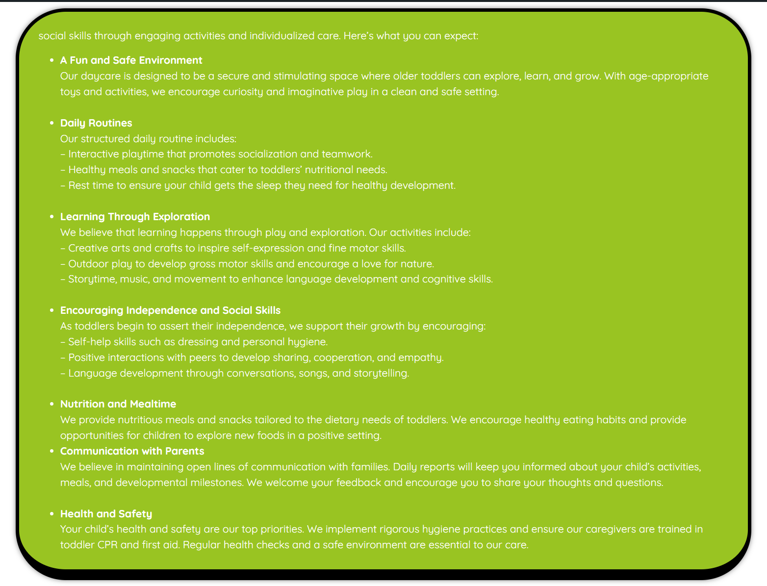 • Health and Safety – Your child’s health and safety are our top priorities. We follow strict hygiene protocols and ensure our caregivers are trained in CPR and first aid. Regular health checks and a safe learning environment are integral to our care.